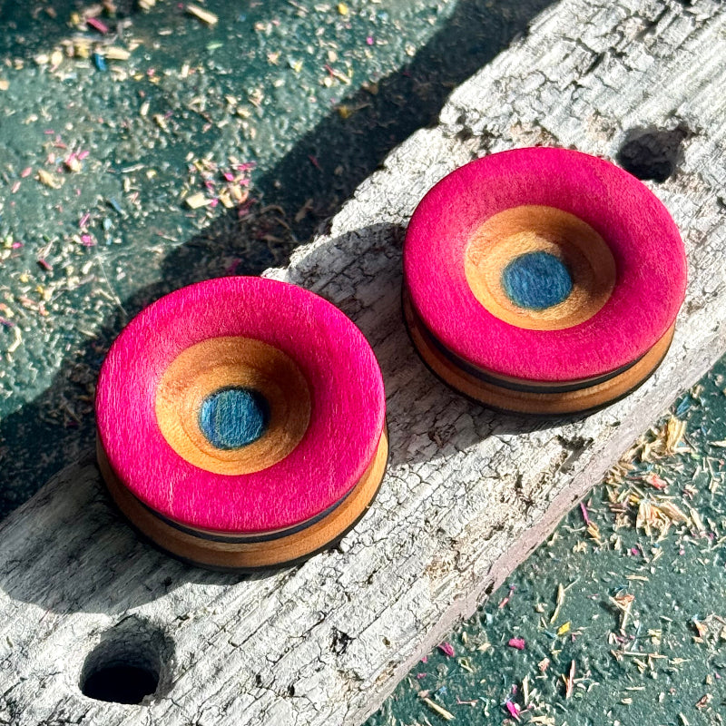Concave face wooden ear plugs made from recycled skateboard decks, featuring pink, black and blue colour tones with visible concentric patterns formed from the board’s internal structure. The shallow dish profile creates depth while exposing the natural composition of the material. The design is reversible, allowing both sides to be worn.